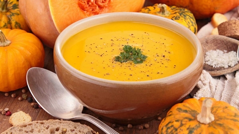 تسخن الزبدة في قدر ويقلى فيها البصل، ثم تضاف مكعبات البطاطا ويتابع القلي، ثم تضاف مكعبات اليقطين ويتابع القلي على نار متوسطة لمدة 3 إلى 4 دقائق.