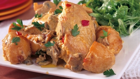 تسكب هذه الصلصة فوق محتويات الطبق الزجاجي قبل إدخاله إلى فرن محمى مسبقاً. يترك الطبق في الفرن حتى ينضج الدجاج ويمتص كل الماء.