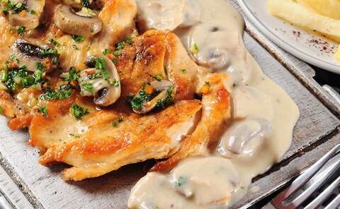 – نضيف السوائل المترسبة من صدور الدجاج، والكريما ونترك الصلصة تطهى إلى أن تصبح كثيفة بما يكفي لتغطي ظهر ملعقة خشب عند تغميسها وإخراجها.