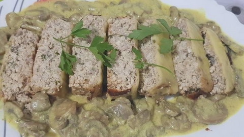 في مقلاة فيها قليل من الزيت نقلي الدجاج مع ملح وفلفل أسود وقرفة ونفس الشيء مع اللحم. نخلطهم مع بعض في إناء نضيف لهم المعدنوس وقليل من الكريمة السائلة والجبن والبيض حتى نتحصل على خليط سائل نفرغه في مول خاص بالكيك مدهون بالزبدة وندخله الفرن على حرارة هادئة وعندما ينضج نضع عليه جبن المربعات. في طاجين، نضع قليل من زيت وزبدة ونقلي الفطر مع البصل الرند والملح والفلفل الاسود والقرفة والزنجبيل والكركم نمرق بقليل من الماء الساخن ونتركها تنضج عندما تعقد نضيف لها الكريمة السائلة تغلي شوية ونطفي.