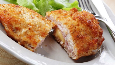 نقلي قطعة الدجاج بالزيت النباتي حتى تصبح بلون بني مقرمش، ثم نصفيها على ورق مطبخ.
