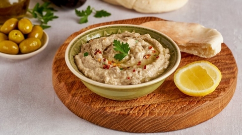 وزعي متبّل الباذنجان في طبق التقديم ورشي عليه زيت الزيتون، ثم قدميه.
