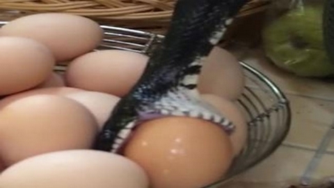 فوجئت عائلة جنوب الولايات المتحدة الأمريكية، بثعبان يتدلى من أرفف المطبخ، ويحاول ابتلاع بيضة.