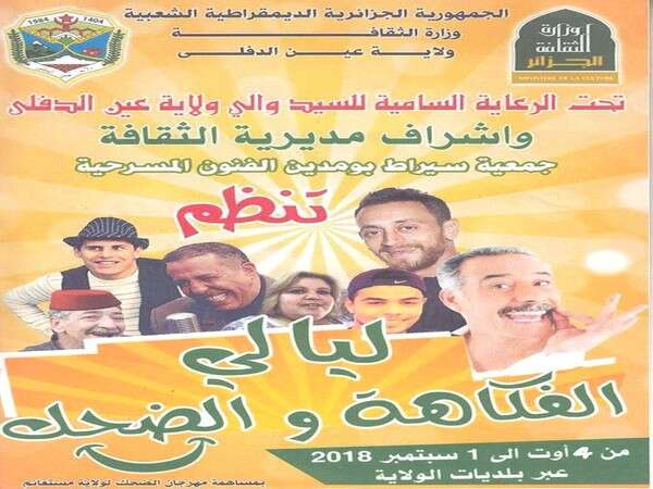 انطلقت فعاليات “ليالي الضحك” في مناطق عدة من ولاية عين الدفلى. ويأتي المهرجان بمبادرة من جمعية “سيراط بومدين للفنون المسرحية”، ويستضيف عدداً كبيراً من نجوم الفكاهة في الجزائر. وافتتحت التظاهرة