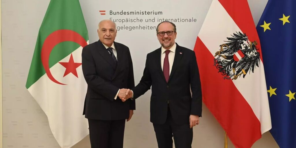 أجرى، الأربعاء. وزير الشؤون الخارجية والجالية الوطنية بالخارج، أحمد عطاف، جلسة عمل مع نظيره النمساوي، ألكسندر شالنبيرغ، خلال الزيارة الرسمية التي يقوم بها إلى جمهورية النمسا الفيدرالية بتكليف من رئيس الجمهورية، عبد المجيد تبون.