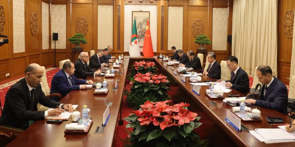 وقد تركزت المحادثات بين الوزيرين -حسب البيان- “حول علاقات التعاون والشراكة التي تربط بين البلدين الصديقين، لا سيما تقييم التقدم المحرز في تنفيذ مخرجات زيارة الدولة التي قام بها رئيس الجمهورية، السيد عبد المجيد تبون، إلى الصينمنتصف العام الماضي”.