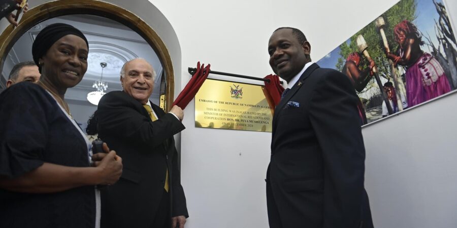 أشرف أحمد عطاف، وزير الدولة وزير الشؤون الخارجية والجالية الوطنية بالخارج والشؤون الأفريقية رفقة نظيره الناميبي،بيا موشيلنجا، وزير العلاقات الدولية والتعاون، على مراسم تدشين مقر سفارة جمهورية نامبيا، اليوم بالجزائر العاصمة.