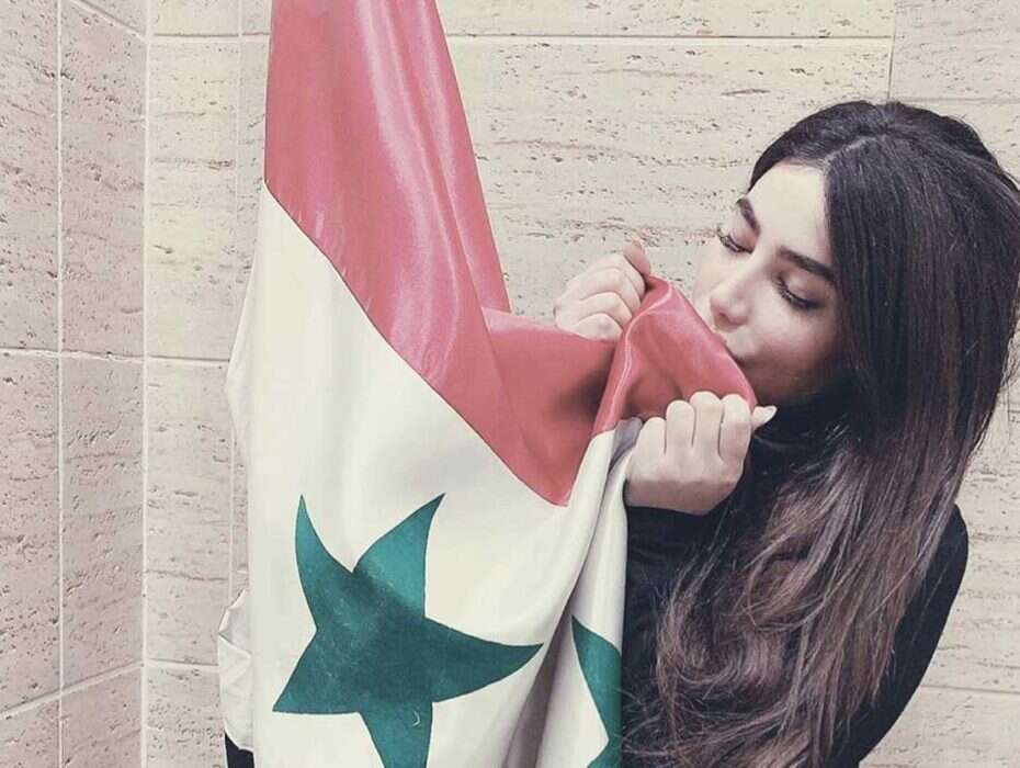 كما ظهرت في صور أخرى وهي تقبّل العلم السوري وكتبت: “راياتك بالعالي يا سوريا على طول الزمان بلدنا الغالي يا سوريا يا أحلى الأوطان.. عزك أهلك.. جيشك أرضك للعالم عنوان.. بلد الكرم والشهامة… بلد الأبطال ربي يديم عزك علينا ويحمي قائدنا ورمزنا الدكتور بشار حافظ الأسد”.