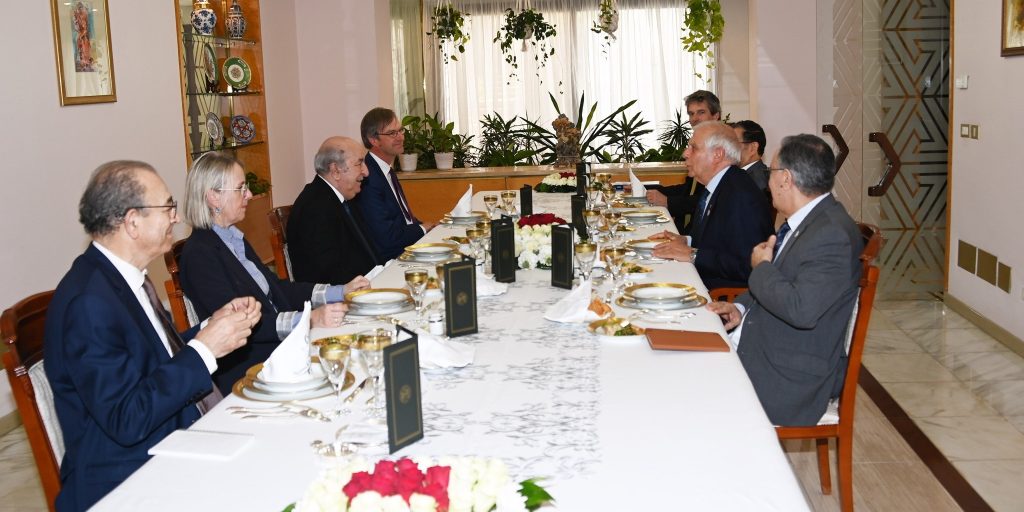 جمع غداء عمل، الإثنين، بالجزائر العاصمة، رئيس الجمهورية، السيد عبد المجيد تبون والممثل السامي للاتحاد الأوروبي للشؤون الخارجية والسياسة الأمنية، نائب رئيس اللجنة الأوروبية، السيد جوزيب بوريل، بحضور إطارات سامية من الجانبين، حسب بيان لرئاسة الجمهورية.