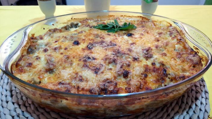 نحضر اللحم المفروم بتذبيل البصل مع ملعقتين زيت، نضيف اللحم المفروم ومكعبات الفلفل الحلو نضيف الملح والفلفل الاسود مع التحريك حتى ينضج نصف استواء