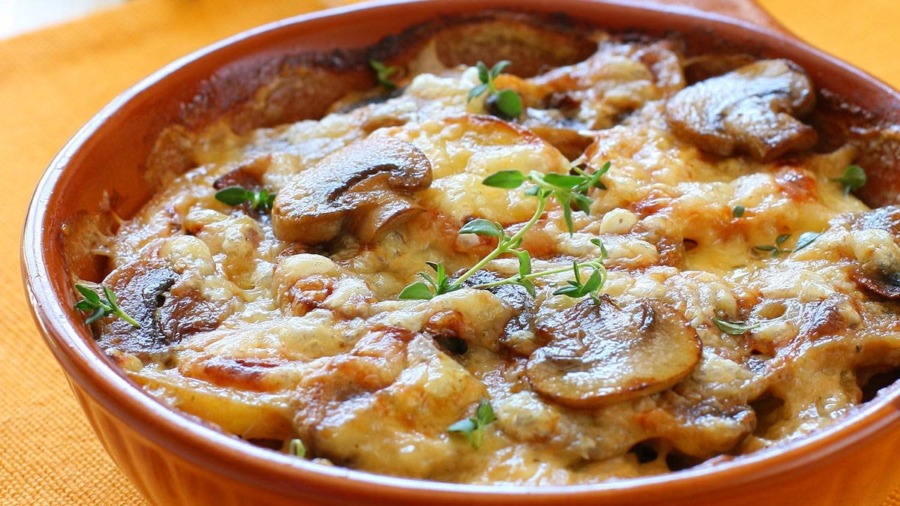 في مقلاة على نار متوسطة نقلي الفطر مع الزبدة جيدا حوالي 6 دقائق، ننزعها من على النار ونتركها جانبا في إناء نخفق البيض والحليب والتوابل نضيف البطاطا والفطر والجبن المبشور ونسكب الخليط في صينية أو صحن يدخل الفرن مدهون بالزبدة وندخلها لفرن مسخن مسبقا لمدة 35 إلى 40 دقيقة.
