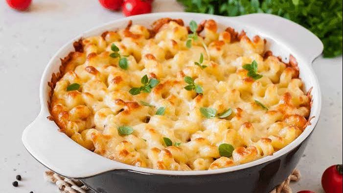 بإناء نضع المعكرونة المطهية والمصفاة، نضيف عليها التونة والبيشاميل ونفرغها بصينية تدخل الفرن مدهونة قليلا بالمارغرين، نزين وجهها بالجبن المبشور ندخلها الفرن المسخن مسبقا ونتركها تتجمر قليلا وتتحمر من الأعلى.