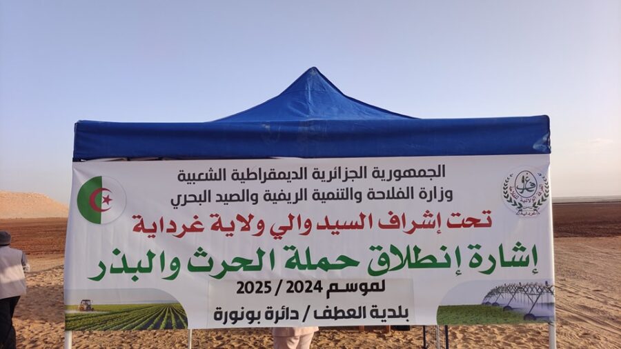 أعطى الخميس المنصرم والي ولاية غرداية عبد الله أبي نوار بإحدى المستثمرات الفلاحية الواقعة بمحيط تيمساسين ببلدية العطف إشارة إنطلاق حملة الحرث والبذر للموسم الفلاحي الجاري 2025/2024, على , مساحة إجمالية قوامها 2048 هكتار لزراعة مختلف أصناف الحبوب