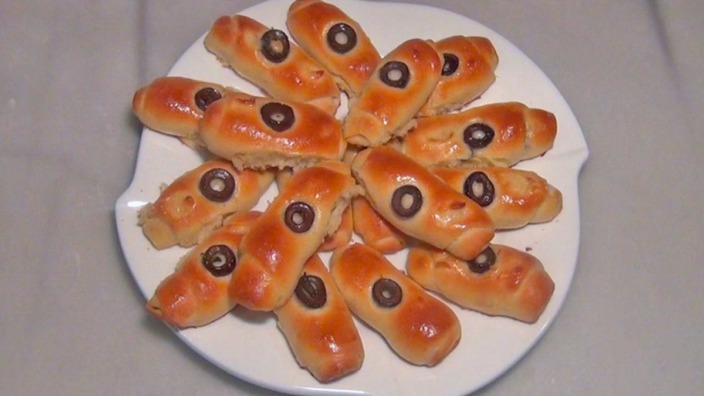 - ندهن الفطائر بالبيض، ونضع على كل فطيرة شريحة زيتون ونضغط عليها بلطف، ثم نغطي الصينية بورق نايلون غذائي ونتركها ترتاح لمدة ساعة بدرجة حرارة الغرفة.