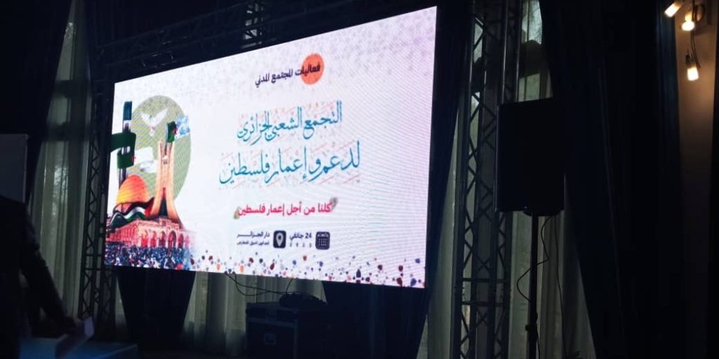 كما تم خلال التجمع الشعبي عرض شريط فيديو يبرز مساهمات و انجازات الجزائر في اعمار فلسطين, في قطاعات الصحة, السكن, التعليم, البنى التحتية والاوقاف.