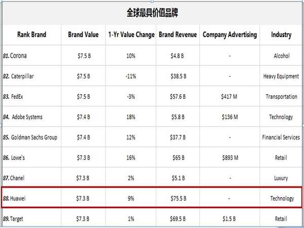 نشرت مؤخرا فوربس قائمة العلامات الأكثر قيمة في 2017 وقد صنف هواوي في المرتبة 88 عالميا بقيمة علامة بلغت 7.3 مليار دولار وبارتفاع بلغ 9 % مقارنة بالسنة الفارطة، كما أن هواوي هي العلامة الصينية الوحيدة