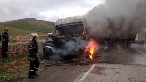 ووفق ذات المصالح فإن الحادث “تمثل في اصطدام بين شاحنة نصف مقطورة وسيارة ، تبعه حريق كلي للمركبتين مما خلف وفاة شخصين متفحمين وإصابة آخر بجروح تم نقله بعد إسعافه إلى مستشفى الخروب” .