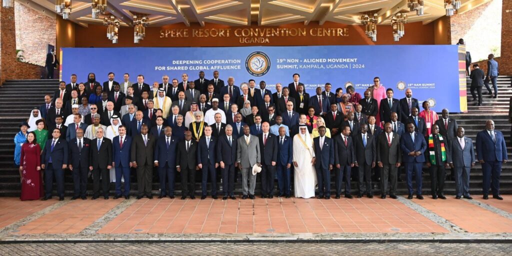 وأشاد البيان الختامي للقمة و”إعلان كمبالا” بدور رئيس الجمهورية، السيد عبد المجيد تبون، بصفته منسقا للاتحاد الإفريقي في مجال مكافحة الإرهاب والتطرف العنيف، كما رحبت الوثائق الختامية للقمة بمبادرة الرئيس تبون لإنشاء صندوق إفريقي خاص بالكوارث الناجمة عن التغيرات المناخية. من جهة أخرى، تضمنت الوثائق الختامية التزام أعضاء حركة عدم الانحياز بالمبادئ والقيم التي تأسست من أجل الدفاع عنها، مثلما دعا إليه رئيس الجمهورية في كلمته التي ألقاها نيابة عنه الوزير الأول، السيد نذير العرباوي. وتم التطرق أيضا إلى قضية الصحراء الغربية والدفاع عن حق الشعوب في تقرير مصيرها. كما شكلت القضية الفلسطينية موضوعا محوريا في البيان الختامي للقمة حيث أجمع أعضاء الحركة على ضرورة تكثيف الجهود لمنح العضوية الكاملة لدولة فلسطين في منظمة الأمم المتحدة وهو المطلب الذي لطالما رافع من أجله رئيس الجمهورية السيد عبد المجيد تبون. وقد أدان أعضاء الحركة، العدوان الصهيوني المستمر على الشعب الفلسطيني داعين إلى تحرك عاجل لإنهاء العدوان ووقف التهجير القسري للفلسطينيين وضمان وصول المساعدات الإنسانية إلى قطاع غزة.