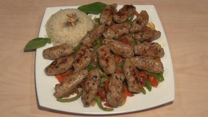 - نغطي قعر طبق التقديم بمزيج البصل والفليفلة ونضع فوقه أصابع الكباب ونقدمه مع الأرز.