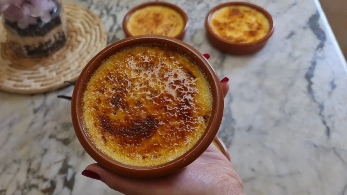 في كاسرول نسخن الكريمة السائلة مع الفنيليا وبإناء اخر نمزج جيدا السكر والصفار حتى يبيض المزيج نضيف بودرة الحليب ونمزج جيدا نضيف نصف كمية الكريمة الساخنة على مزيج البيض والسكر مع التحريك الجيد بالتدريج ثم نضيف باقي كمية الكريمة بعد المزج الجيد نفرغها بقوالب قابلة للطهي بالفرن ندخلها لفرن مسخن مسبقا وتطهى الاحسن بحمام مائي حوالي 50 د على درجة حرارة 100 درجة مئوية بعد الطهي وبعد ما تبرد بالثلاجة نغطي وجه كل قالب بالسكر ويستحسن البني و نقوم بحرقه بواسطة الشانيمو ان لم يوجد ندخلهم الفرن و نشعل الشواية فقط.