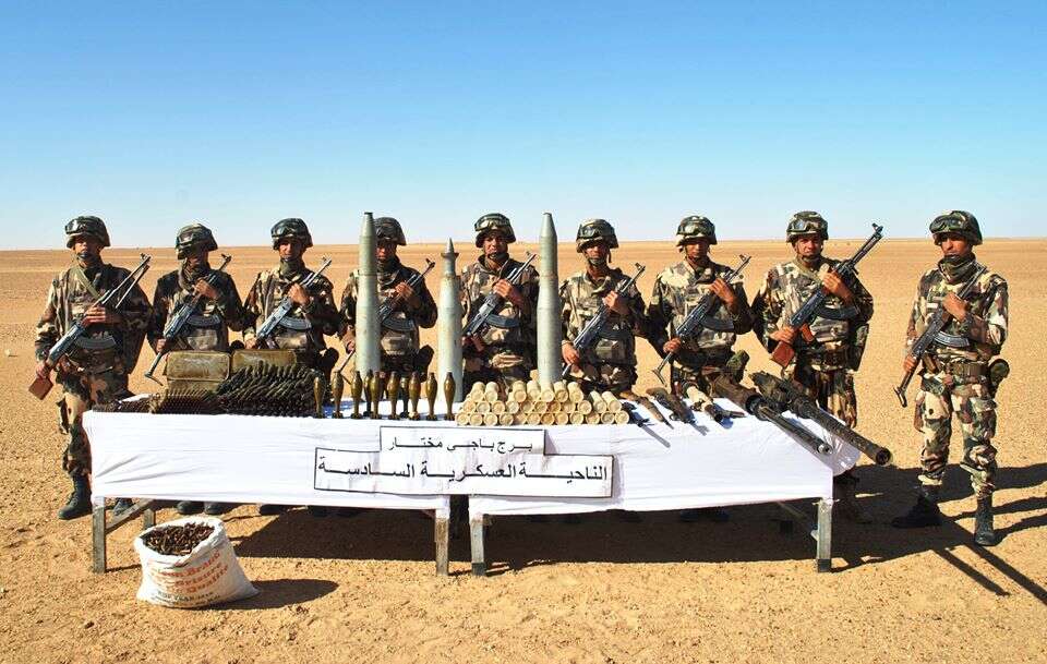 وأوضح البيان، أنه وفي “إطار مكافحة الإرهاب وحماية الحدود وبفضل استغلال المعلومات، وإثر دورية بحث وتمشيط قرب الشريط الحدودي الجنوبي ببرج باجي مختار/الناحية العسكرية 6، كشفت مفرزة للجيش الوطني الشعبي يوم 17 ديسمبر 2019، مخبأ للأسلحة والذخيرة يحتوي على رشاشين ثقيلين عيار 14.5 ملم، وقاذف صاروخي من نوع RPG-2 وبندقية نصف آلية من نوع سيمونوف، وبندقية تكرارية، وكذا على ماسورة لبندقية رشاشة من نوع FM”.