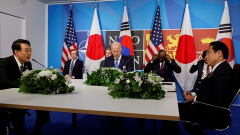 والتقى قادة الولايات المتحدة وكوريا الجنوبية واليابان، على هامش قمة حلف شمال الأطلسي، الأسبوع الماضي، واتفقوا على “استكشاف