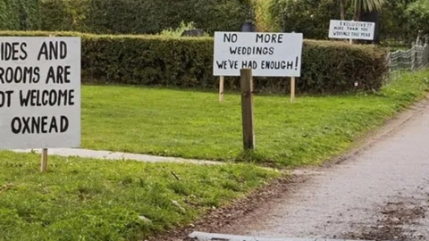“العرائس والعرسان غير مرحب بهم في أوكسنيد” وهي يافطة وضعها السكان المحليون الذين يعيشون بجوار العقار التاريخي من القرن السادس عشر في إيلشام، نورفولك. وكتبوا على لافتات أخرى “حصري؟ أكثر من 100 حفل زفاف هذا العام”، “لا مزيد من حفلات الزفاف لدينا ما يكفي”.