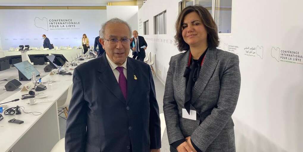 وعلى هامش مؤتمر باريس حول ليبيا، التقى وزير الشؤون الخارجية، رمطان لعمامرة، مع وزيرة خارجية دولة ليبيا، نجلاء المنقوش، بحسب ما جاء في صفحة الوزارة على فايسبوك. وذكر لعمامرة لنظيرته، أن الجزائر ملتزمة وواقفة بثبات وإخلاص إلى جانب ليبيا، حتى يستتب الأمن والاستقرار ويلتئم شمل الأشقاء الليبيين.