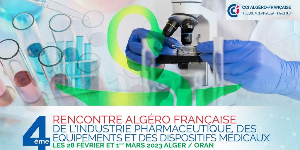 تنظم الغرفة الجزائرية-الفرنسية للتجارة والصناعة، الدورة الرابعة للقاءات الجزائرية-الفرنسية للصناعات الصيدلانية والمعدات والمستلزمات الطبية، والتي ستنعقد في الفترة من 28 فيفري إلى 1 مارس 2023، في الجزائر العاصمة ثم وهران.