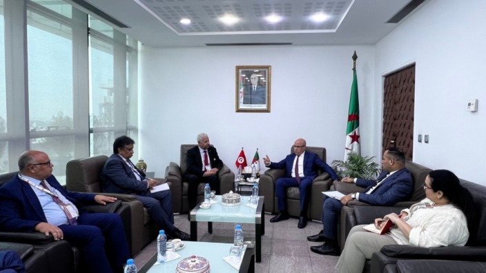 وأوضح البيان أن هذا اللقاء, المنعقد بمقر الوزارة على هامش مشاركة الوزير التونسي في فعاليات الطبعة الرابعة لمعرض التجارة البينية الإفريقية بالجزائر (4 -10 سبتمبر), شكل مناسبة للتأكيد على إرادة الجانبين في تطوير التعاون الثنائي.