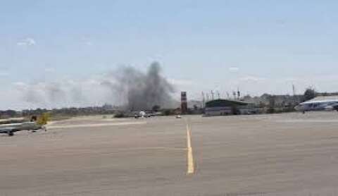 تتعرض مواقع داخل مطار معيتيقة في العاصمة الليبية طرابلس، السبت، لقصف عنيف بالمدفعية الصاروخية، فيما تتصاعد أدخنة سوداء فوق المكان.
