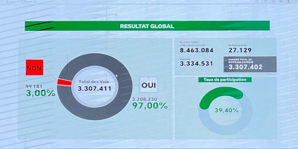 وأوضحت السلطة المستقلة لتدبير الانتخابات، أن نسبة 3% من المصوتين، عارضوا الدستور الجديد، وأن نسبة المشاركة بلغت 39.40%.