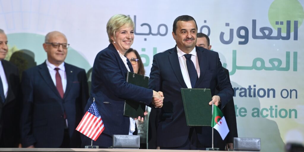 قام، الإثنين، كل من وزير الطاقة والمناجم، محمد عرقاب، سفيرة الولايات المتحدة الأمريكية لدى الجزائر، ممثلة وزارة الخارجية الأمريكية، اليزابيت اوبين مور، بالتوقيع على مذكرة تفاهم بخصوص التعاون في مجال العمل المناخي والحد من انبعاثات الغازات الدفيئة خاصة الميثان، بمركز المؤتمرات “محمد بن أحمد” بوهران، وهذا بحضور وزيرة البيئة والطاقات المتجددة، ووزير التكوين والتعليم المهنيين، والرؤساء المدراء العامون لسوناطراك وسونلغاز واطارات من الوزارة.