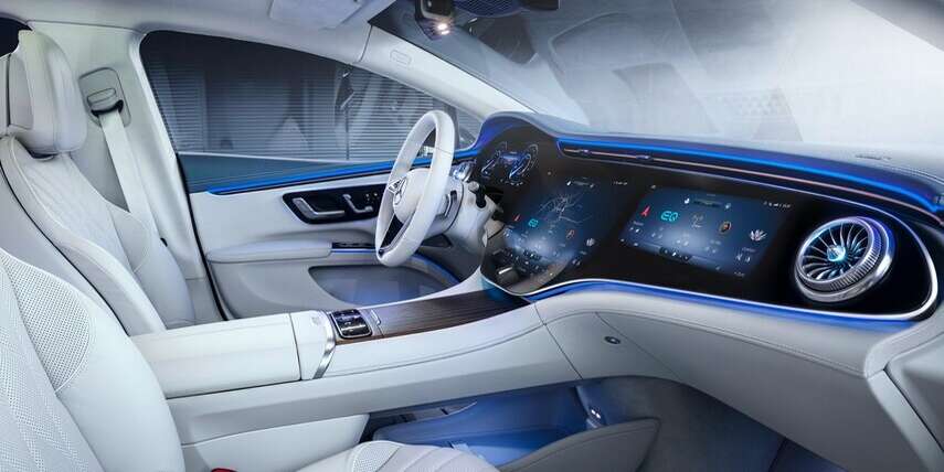 صورت مرسيدس الشاشة المستقبلية Hyperscreen والتي ستوفر ميزات تفاعلية غير مسبوقة بين السيارة والسائق والراكب، وكذلك فسوف تستفيد EQS من مساحات رحبة وأماكن تخزين جديدة مثل أسفل الكونسول الوسطي حيث تستغني السيارة الكهربائية عن ناقل الحركة التقليدي الذي يشغل تلك المنطقة في سيارات الوقود مثل شقيقتها S-Class.