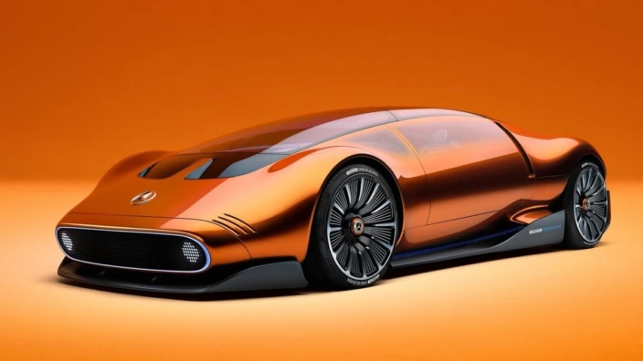 أول ما يلفت النظر هو لون الطلاء البرتقالي الفريد الذي يُعيد إلى الأذهان كلاً من C111 والنسخة الاختبارية Vision One-Eleven. إحدى الصور تُظهر غطاء محرك يتضمن فتحة تهوية مركزية كبيرة وتفاصيل طولية بارزة. وهي عناصر تصميمية تكررت في كلا السيارتين السابقتين.