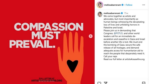 وكانت ميليسا قد كتبت عبر حسابها على إنستغرام: “نجتمع معاً كفنانين ونشطاء، ولكن الأهم من ذلك ككائنات بشرية نشهد الخسائر المدمرة في الأرواح والأهوال التي تتكشف في فلسطين وإسرائيل”.