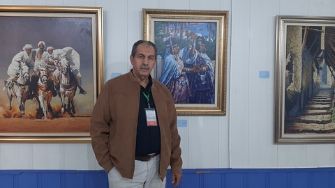 حضور التراث بالنسبة لمقدس، يعني حضور احتفالات “الفانتازيا” بدوي خيالاتها، وبارود بنادقهم، الذي عبق مساحات البراري الشاسعة في أريافنا وبوادينا الجزائرية، وفي إحدى هذه اللوحات الضخمة، يستطيع الزائر أن يتنسم هواء الريف العليل، حيث تتكشف المروج الخضراء والدروب المنبسطة التي يعبرها القرويون بدوابهم، كأنهم يعيشون على أراضي الجنان التي أبدعها الخالق، مع حضور الصحراء والواحات ويوميات أهلها.
