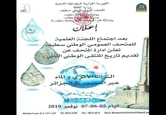 سينظم الملتقى الوطني الثاني حول: “التراث الأثري والماء عبر العصور في الجزائر” في الفترة ما بين 5 إلى 7 نوفمبر المقبل بسطيف، حسب ما علم من مديرة المتحف العمومي الوطني بالولاية .