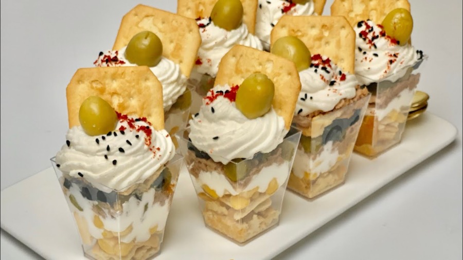نأخذ كؤوس صغيرة نبدأ بوضع البيسكوي المكسر ثم الذرة المصبرة، وبواسطة كيس حلواني نضع كمية من الكريمة ثم التونة والزيتون والكورنيشو ثم الكريمة وهكذا المهم آخر طبقة تكون الكريمة. تزين الكؤوس بالبيسكوي والزيتون.