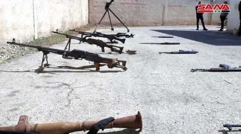 وقال مصدر في الجهات المختصة في حمص: “تم ضبط أسلحة وذخائر مخبأة تحت الأرض في أحد المنازل بريف حمص الشمالي من مخلفات التنظيمات المسلحة وشملت بنادق آلية ورشاشات بينها (بي كي سي) و(دوشكا) وذخائر متنوعة”.