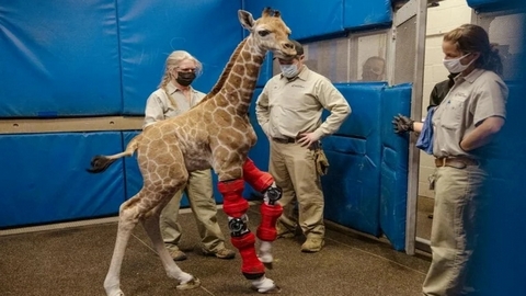 لكن لم تكن لديهم خبرة في تركيب طفل زرافة في الدعامة، ثبت أن ذلك يمثل تحديًا خاصًا نظرًا لأنها كانت طفلة جديدة يبلغ طولها 5 أقدام و 10 بوصات (178 سم) وتزداد طولًا كل يوم.
