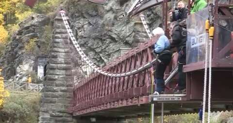 احتفلت تسعينية نيوزيلندية بعيد ميلادها الـ91 بقفزة مثيرة ومخيفة من أعلى جسر بقلب شجاع وجرأة وروح مفعمة بالتفاؤل وهي أم لـ 7 أبناء وجدة لـ 18 حفيدا، الطريف بالموضوع أن الدافع وراء قفزتها، أن زوجها لم يكن يسمح لها بالمغامرة، وبما أنه توفي وهي ما زالت تحس بالشباب والشقاوة، قررت الاحتفال بعيد ميلادها بهذه القفزة.