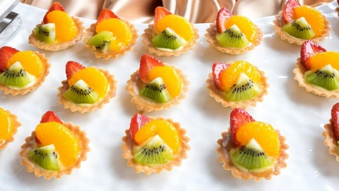 العجين: نخفق بالضراب الكهربائي أو اليدوي كل من المارغارين والزيت والسكر الناعم والبيض ورشة الملح حتى نصل إلى خليط كريمي، نبدأ بإضافة الفرينة مع الخميرة والسكر الفاني حتى نتحصل على عجين طري نغلفه بالبلاستيك ونتركه يرتاح لمدة نصف ساعة بالثلاجة، ثم نشكل كرة صغيرة من العجين نضعها بمول مني تارت المدهون بالزبدة والمرشوش بالفرينة ونبدأ بتشكيل قالب التارت بعدما نشكل كل التارتات نضعهم بالمجمد لمدة ساعة قبل الخبز لكي نضمن عدم نزول حواف الترتات أثناء الخبز نخبزهم بفرن مسخن مسبقا على 160 درجة، بعد خمس دقائق من الطهي نفتح الفرن وبواسطة شوكة نثقب قاعدة العجين ثم نتركهم حتى يأخذوا اللون الذهبي الجميل.