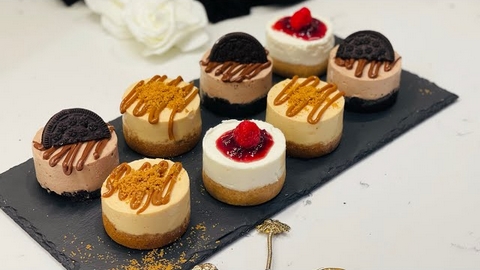 نذيب الشكلاطة بحمام مائي ونضيف لها الكريمة نخلط جيدا وعندما تبرد وتثقال، نزين الميني تشيزكايك ونضع فوقها الفراولة.