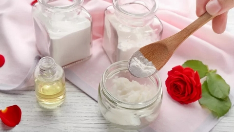 نُضيف بعد ذلك نشا الذرة وصودا الخبز للخليط بالإضافة إلى أي نوع من الروائح الطبيعية كالياسمين.