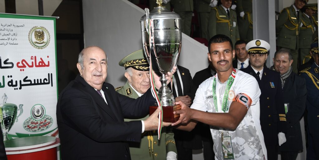 سلم رئيس الجمهورية، القائد الأعلى للقوات المسلحة، وزير الدفاع الوطني، عبد المجيد تبون، لقائد فريق الناحية العسكرية الأولى، كأس الجزائر العسكرية لكرة القدم في طبعتها الـ51، التي فاز بها على حساب فريق القوات البرية بضربات الجزاء (5-4)، حيث انتهت المباراة بالتعادل 0-0 بعد الوقت الإضافي في اللقاء النهائي الذي جرى، الثلاثاء، بملعب مركز تجمع وتحضير الفرق الرياضية العسكرية، الشهيد “مسعود بوجريو” ببن عكنون الجزائر العاصمة.