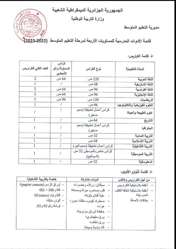 قائمة الأدوات المدرسية للمستويات الأربعة لمرحلة التعليم المتوسط للموسم الدراسي 2023/2022