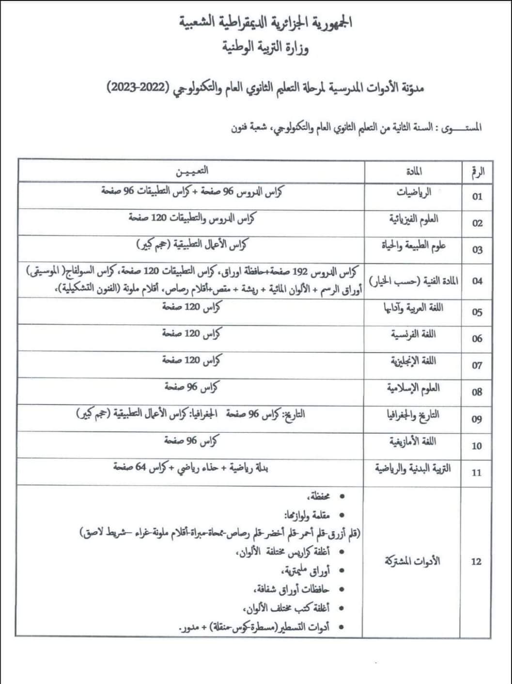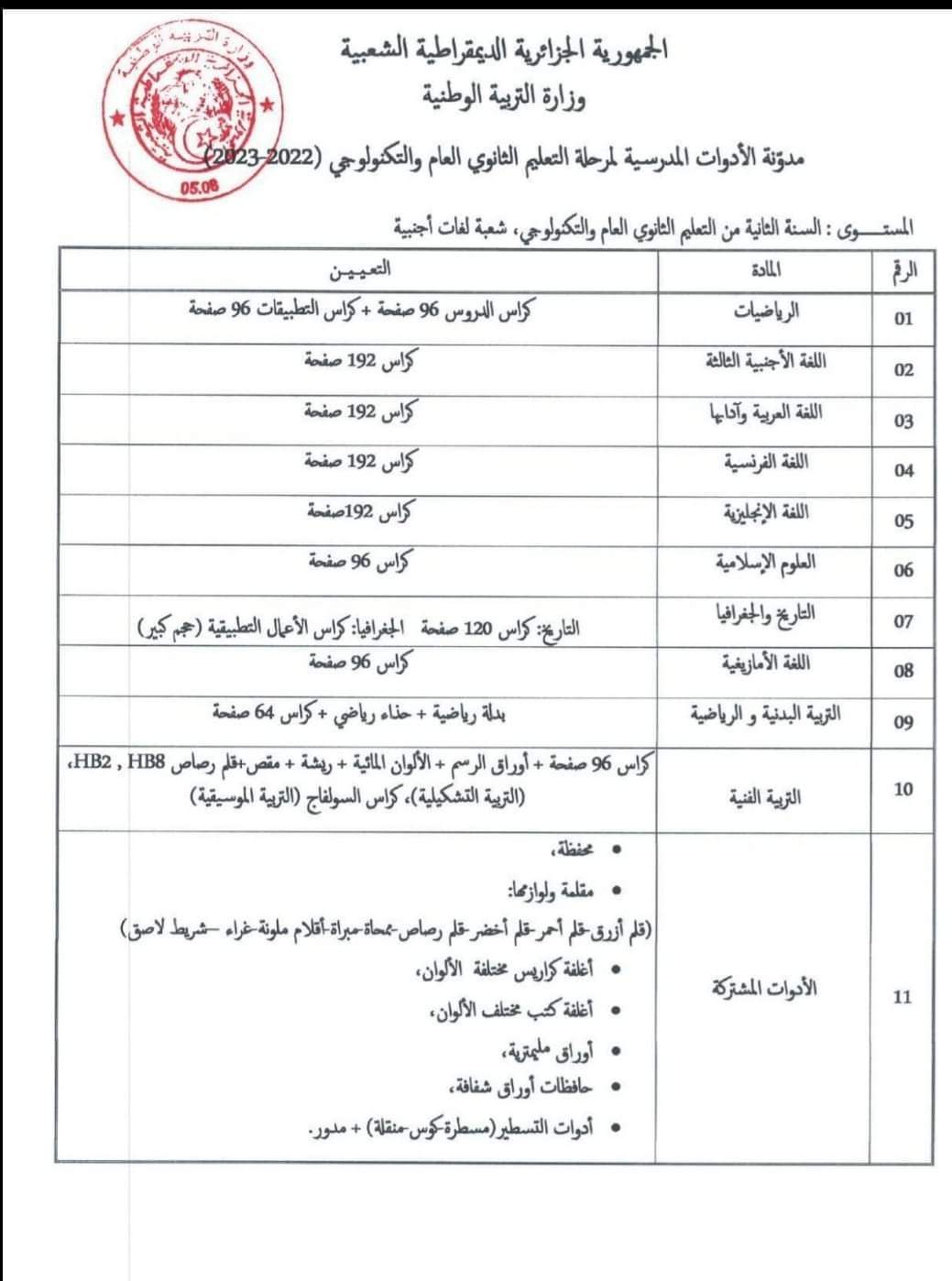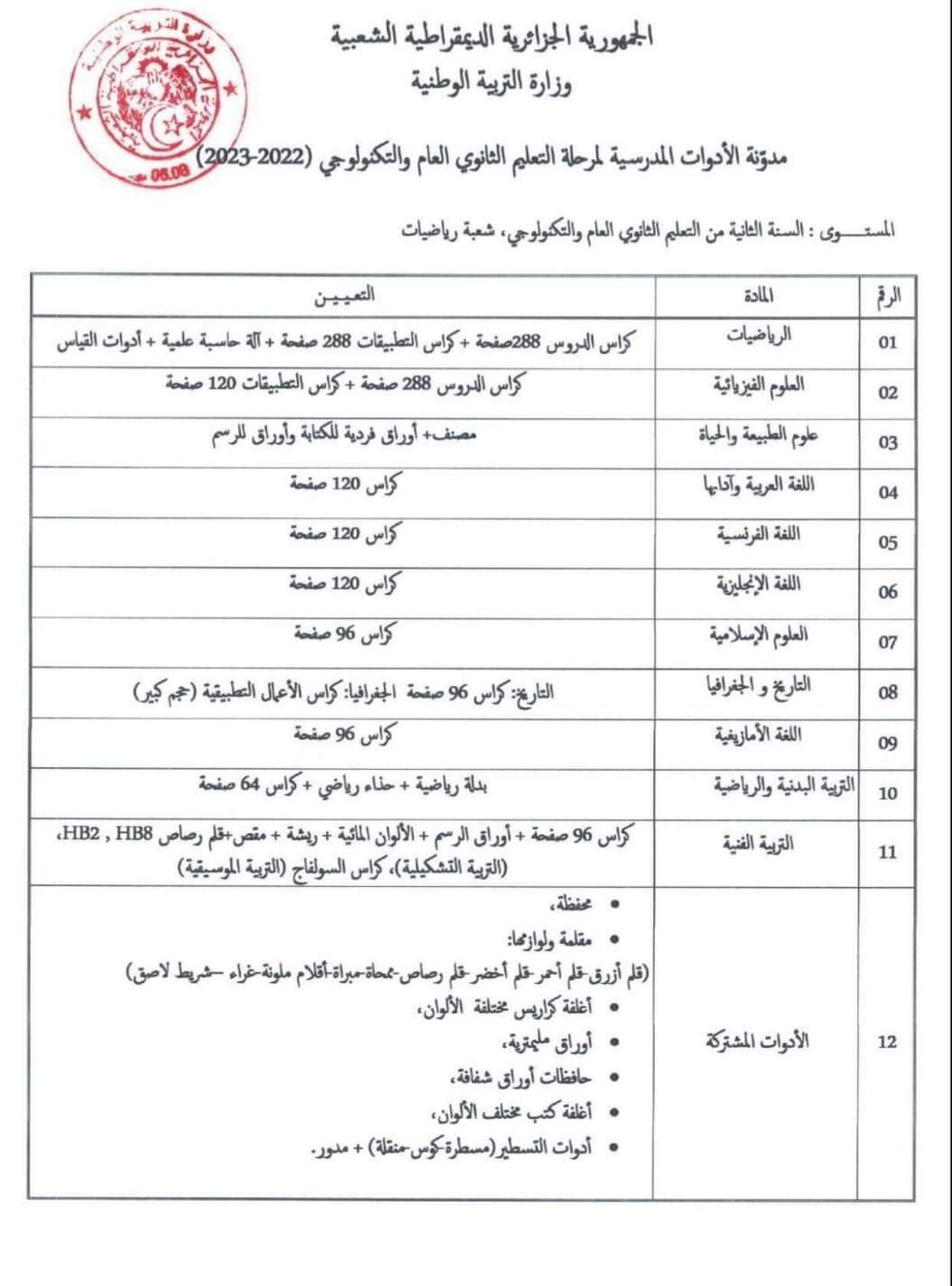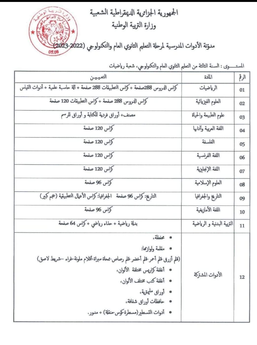 قائمة الأدوات المدرسية للمستويات الثلاثة لمرحلة التعليم الثانوي للموسم الدراسي 2023/2022