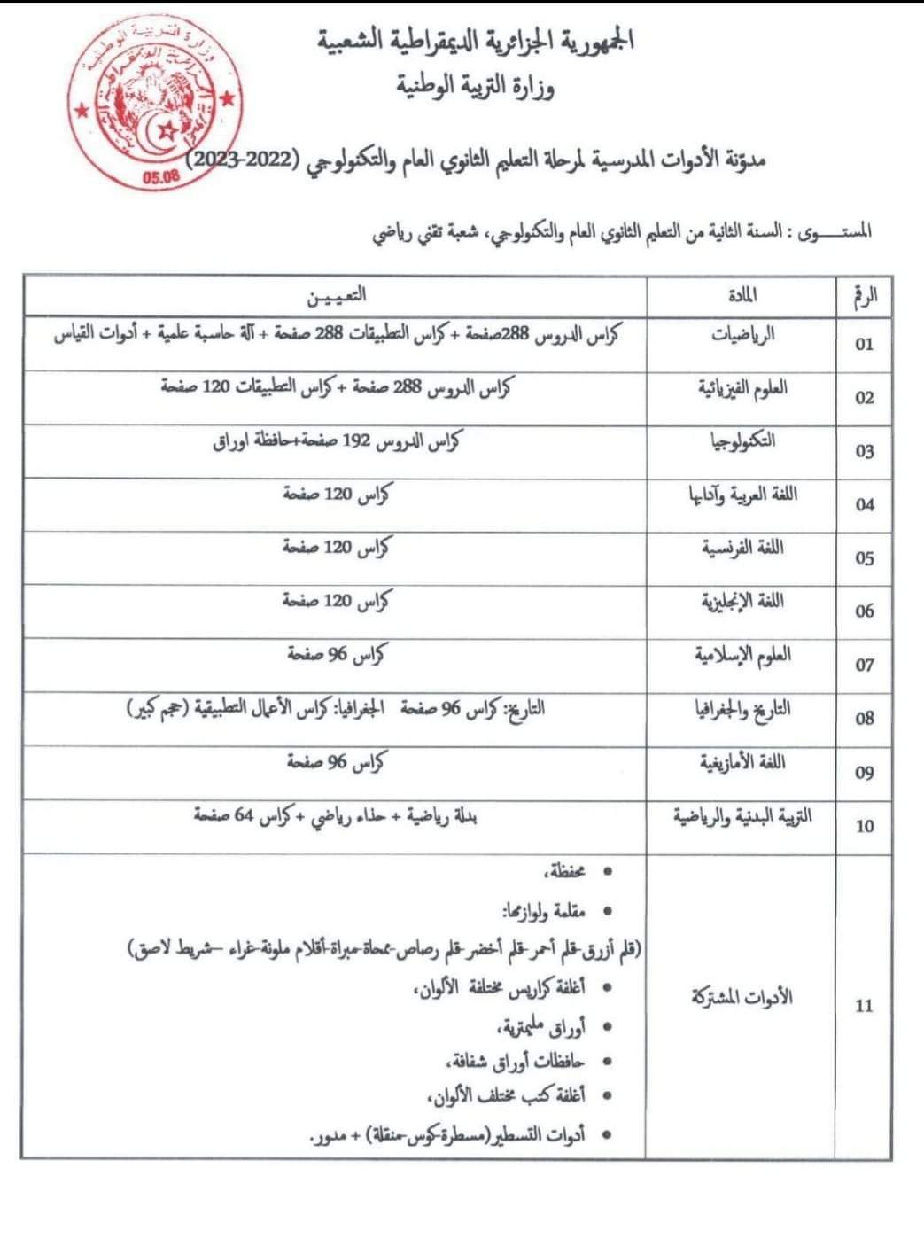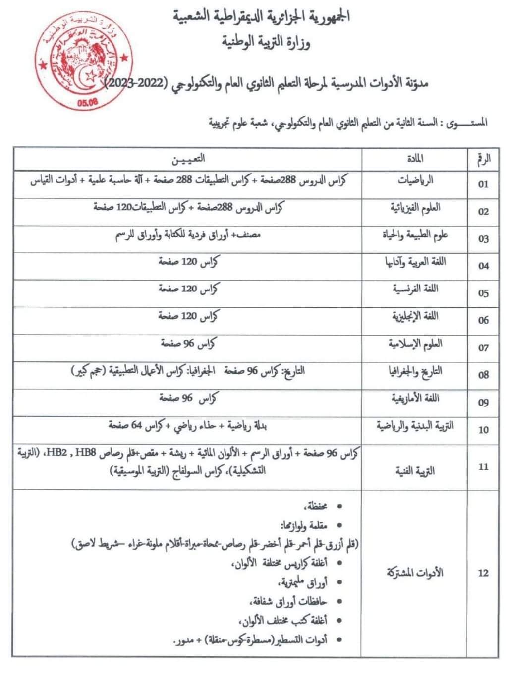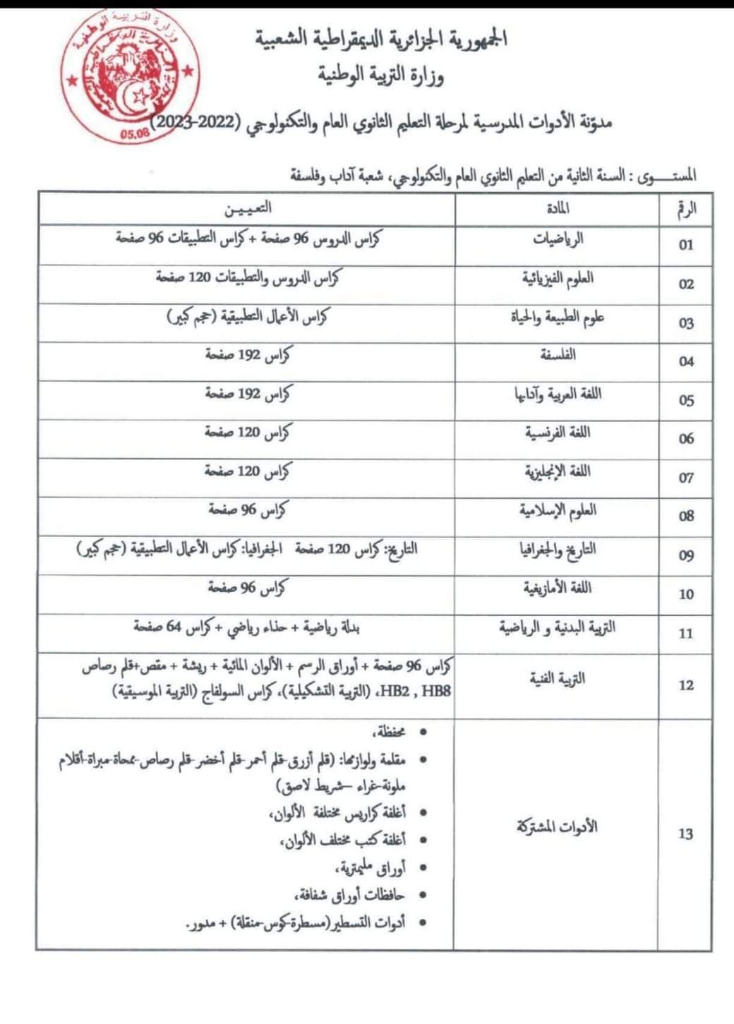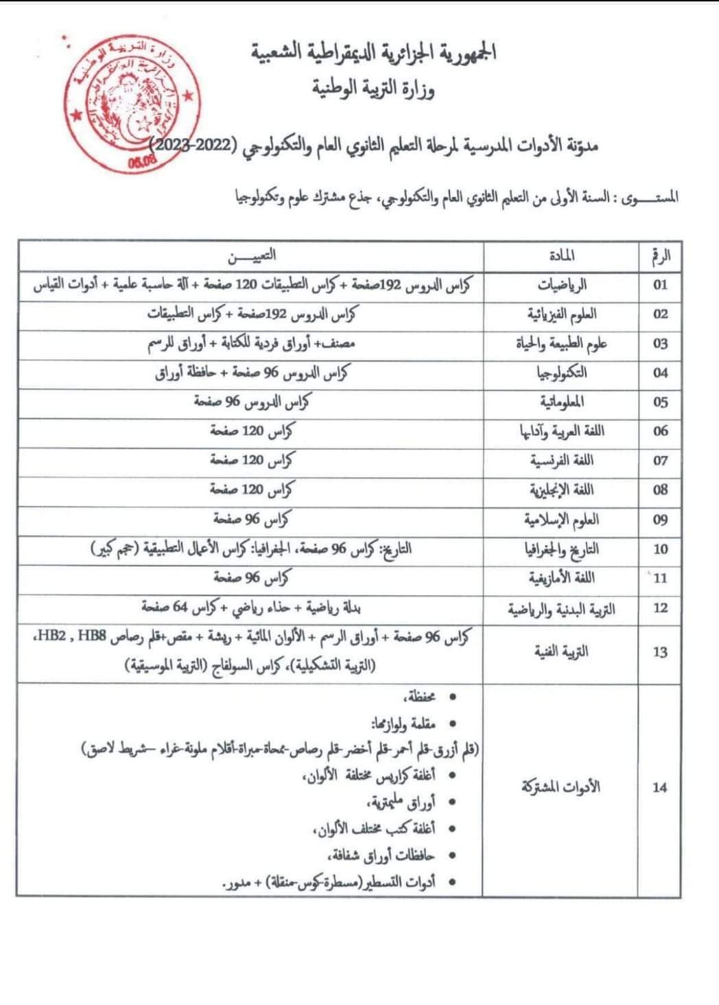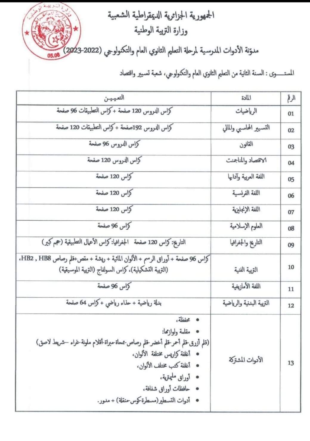 قائمة الأدوات المدرسية للمستويات الثلاثة لمرحلة التعليم الثانوي للموسم الدراسي 2023/2022