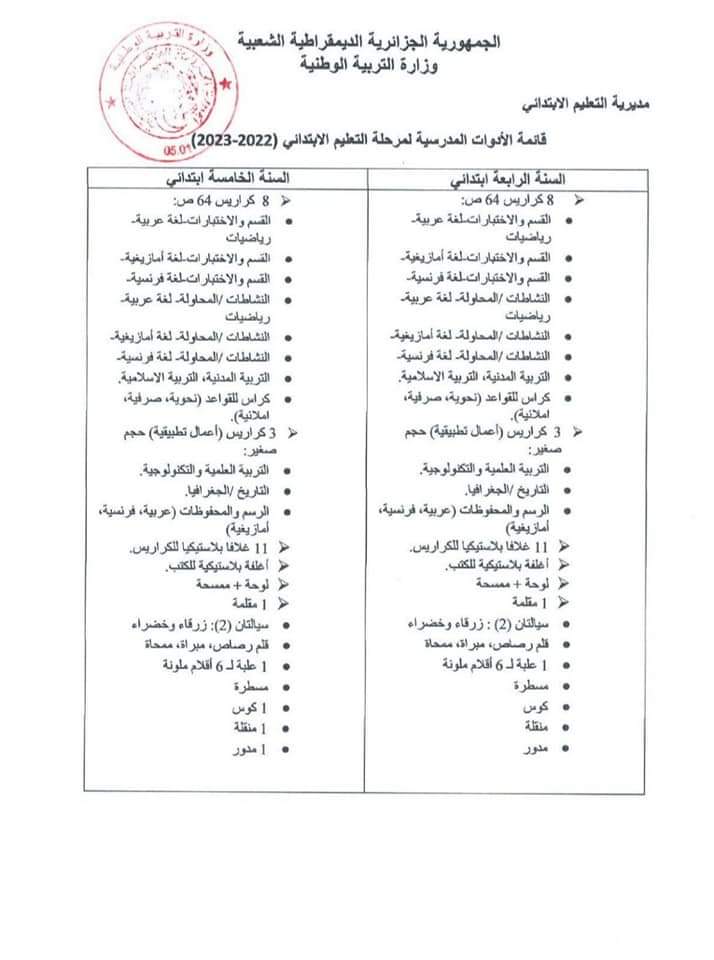 قائمة الأدوات المدرسية لمرحلة التعليم الإبتدائي للموسم الدراسي 2023/2022